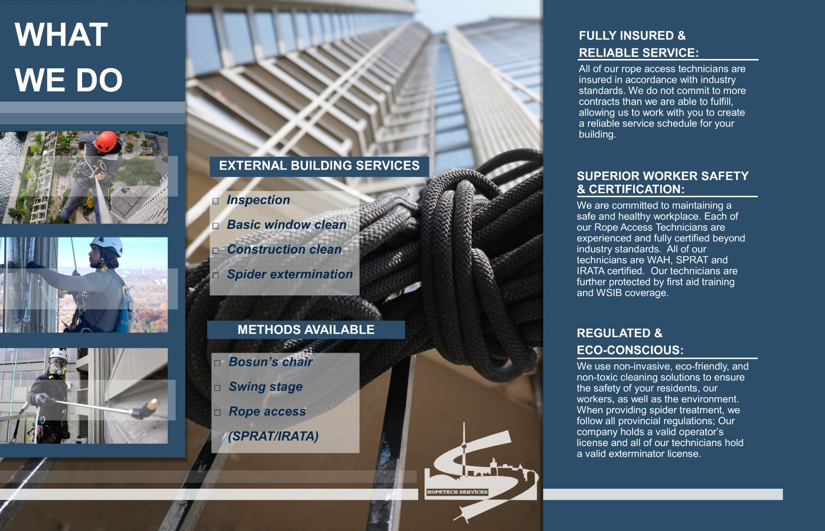All We are committed to maintaining a safe and healthy workplace. Each of our Rope Access Technicians are experienced and fully certified beyond industry standards. All of our technicians are WAH, SPRAT and IRATA certified. Our technicians are further protected by first aid training and WSIB coverage.